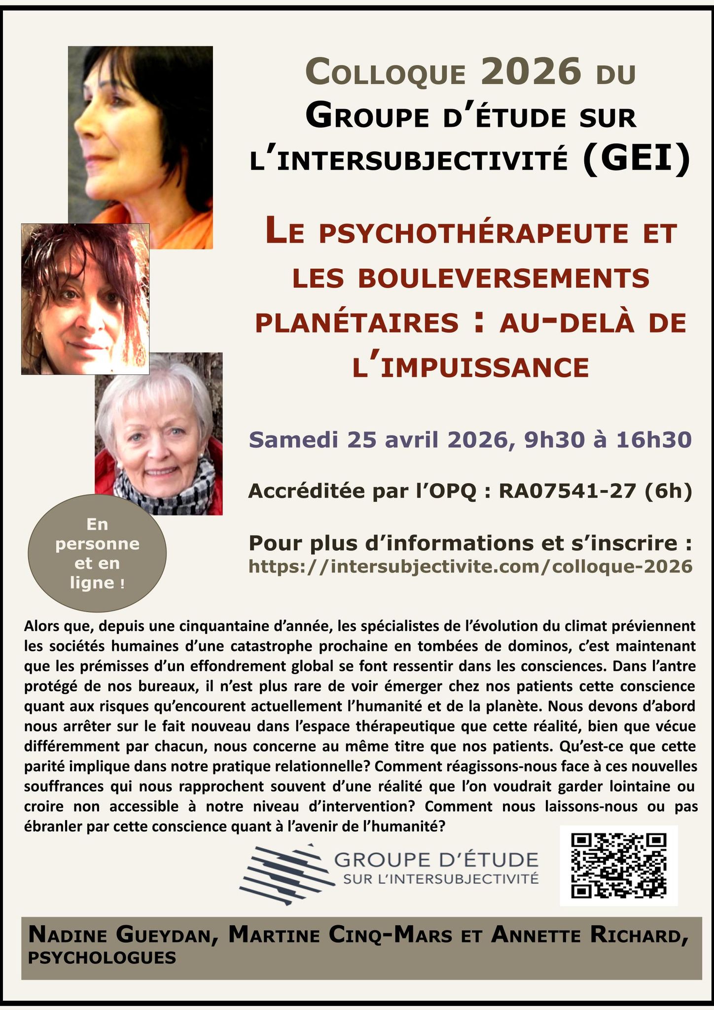 PrésentatricesNadine Gueydan, psychologue et superviseure, exerce en pratique privée depuis 1980. Diplômée en philosophie (Lyon. France), elle a étudié la psychologie à l'Université de Montréal. Formée d'abord à l'approche existentielle humaniste, elle se rallie depuis trente ans à l'approche intersubjective, y approfondissant de manière continue sa vision et sa pratique. À de nombreuses reprises dans le passé, elle a transmis ses connaissances des fondements philosophiques de l’intersubjectivité aux collègues du GEI.